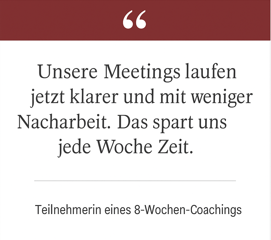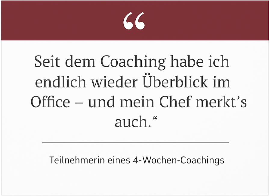 Ergebnis: Nach vier Wochen arbeitete sie 30 % strukturierter und gewann täglich rund 45 Minuten – der Chef merkte den Unterschied sofort.